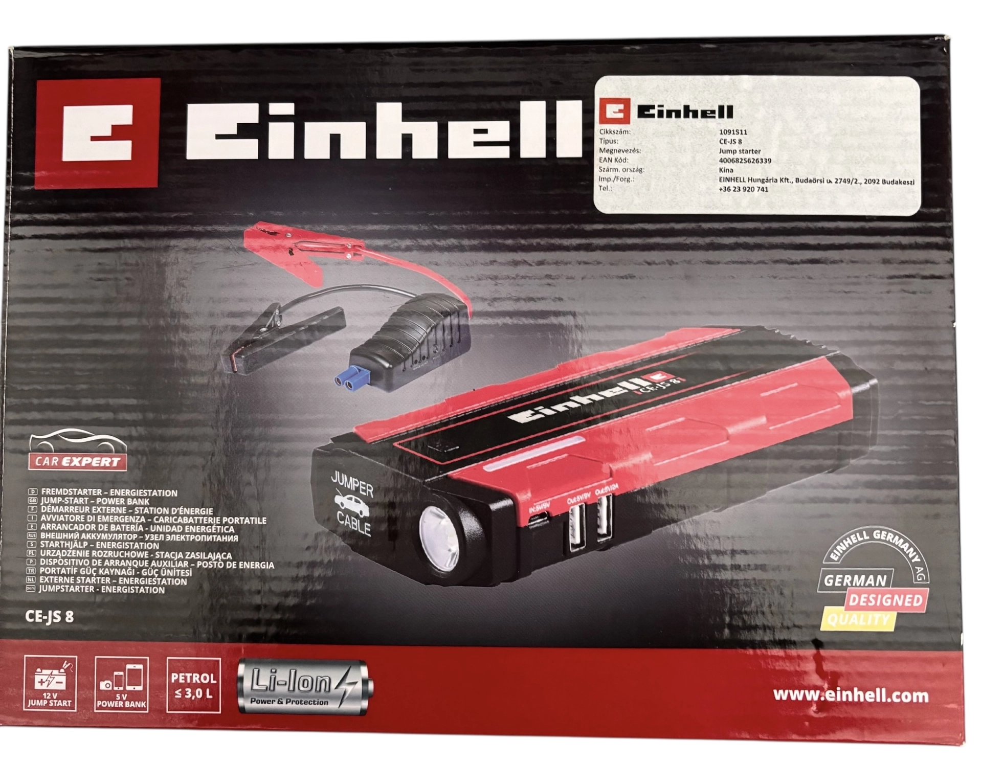 A CE-JS 8 egy sokoldalú, 3 az 1-ben eszköz: indítókészülék, powerbank és LED zseblámpa. Ideális segítség útközben, ha lemerül az autó akkumulátora vagy tölteni kell egy mobilkészüléket.