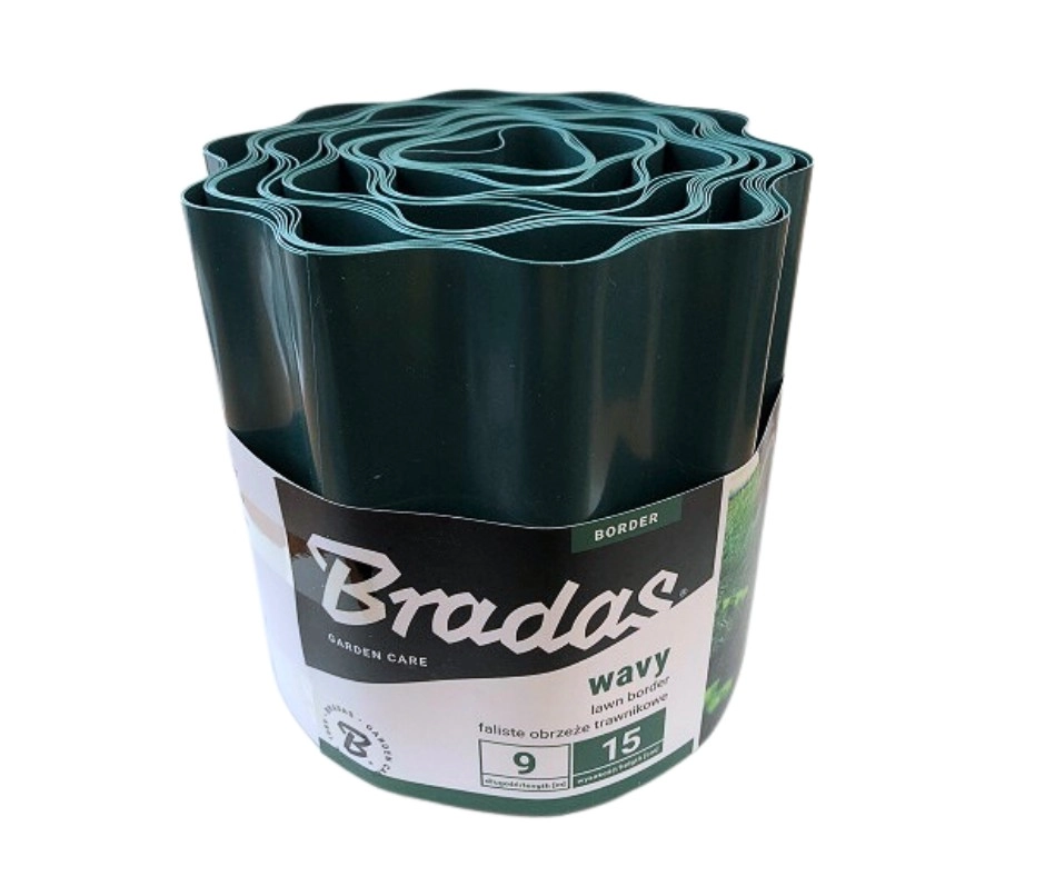 15 cm magas, 9 méter hosszú hullámos, műanyag gyepszegély, sötétzöld színben.